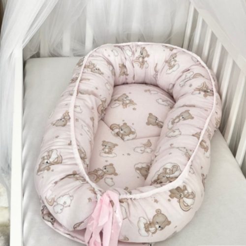 Az rózsaszín szivárványos maci babafészek egy nyugodt, szeretetteljes kuckó, ahol a kisbabád minden napját biztonságban és kényelemben kezdheti. A bézs alapon álmodozó mackó és a színes felhők nemcsak kedves hangulatot teremtenek, hanem vizuálisan is megnyugtató környezetet biztosítanak – kisfiúknak és kislányoknak egyaránt ajánlott, már újszülött kortól.