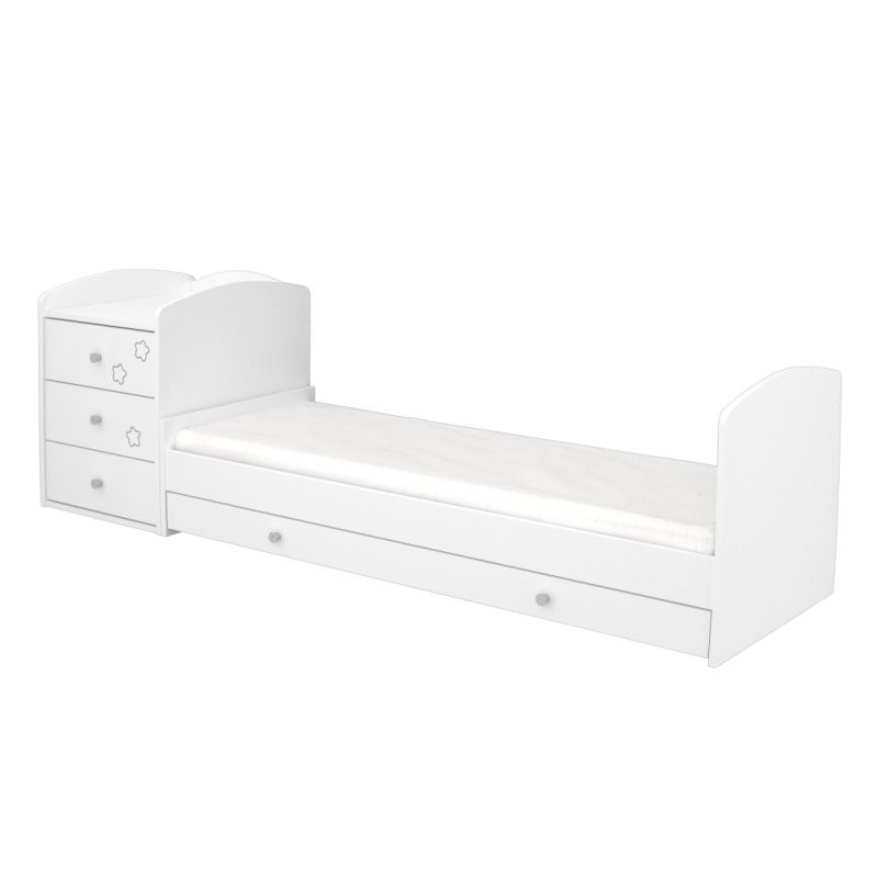 Praktikus és hosszú távra tervezett Timba Félix kombinált kiságy, amely babaágyként, pelenkázóval és később junior ágyként is használható. 3 fiókos tároló, helytakarékos kialakítás és vidám fehér/csillagos dizájn a babaszobába.